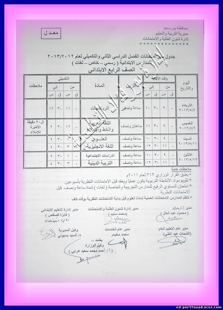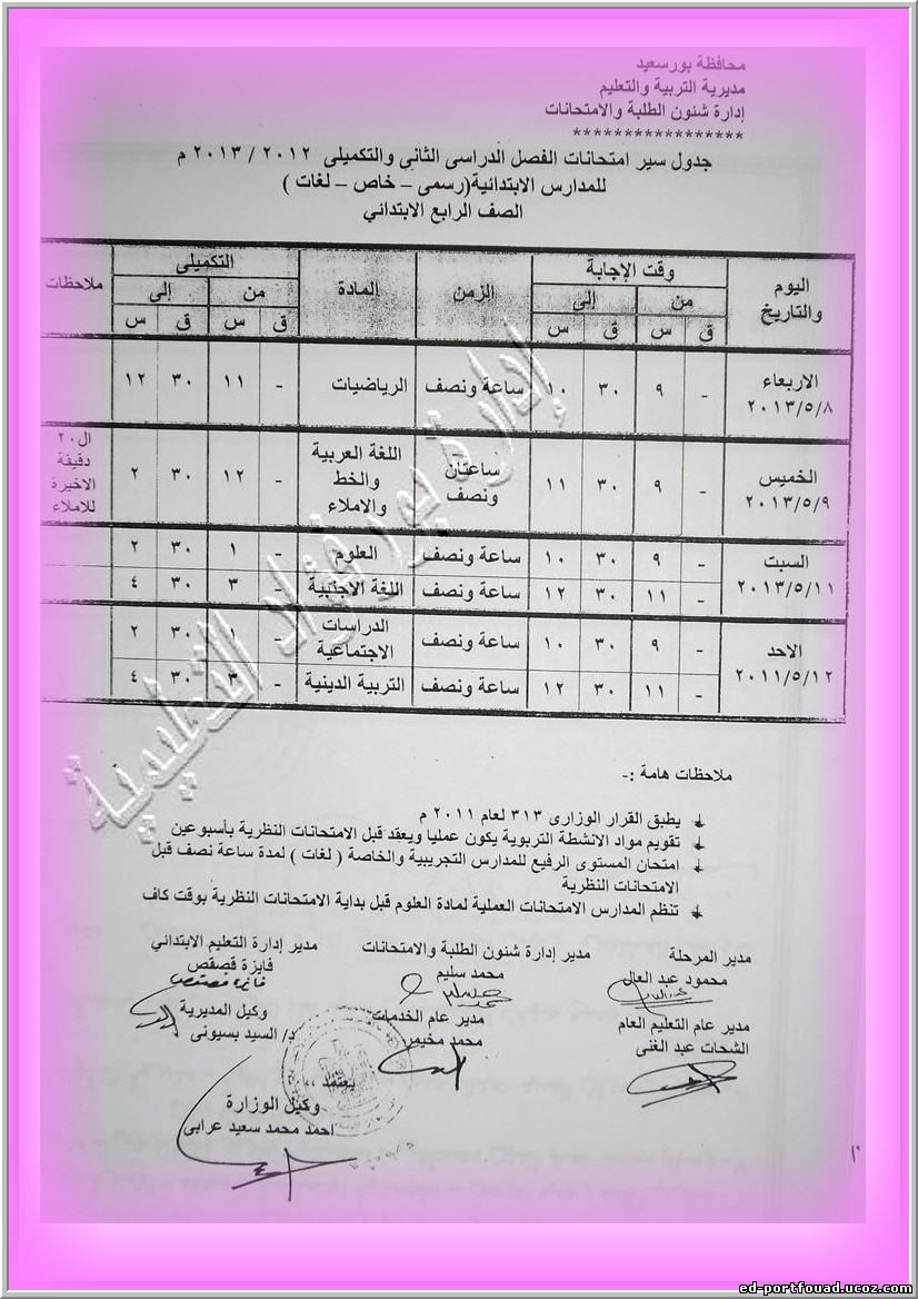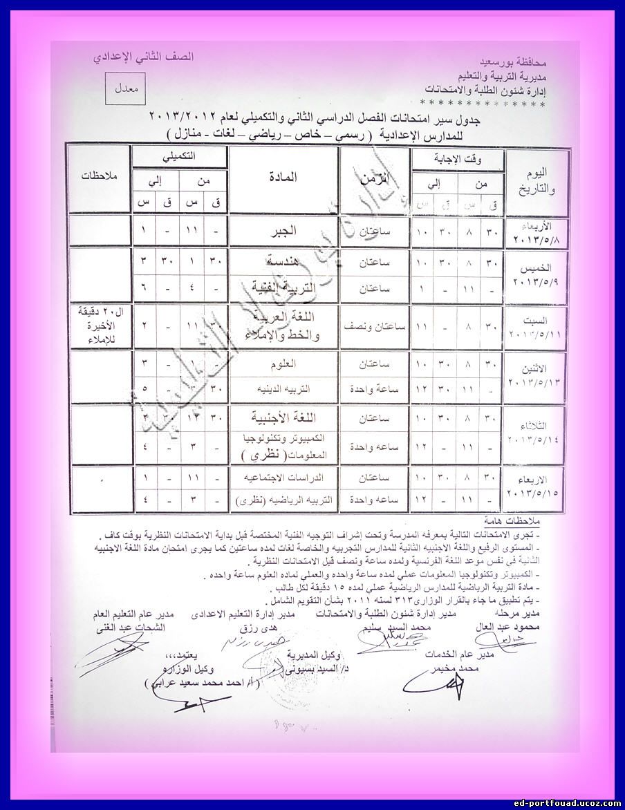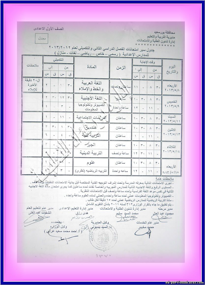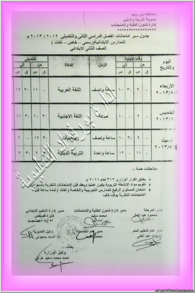 في إطار حرص مديريه التربية والتعليم ببورسعيد وتحت رعايه محافظ بورسعيد ووكيل الوزارة ومجلس الآباء والأمناء بمحافظه بورسعيد في إثراء العملية التعليمية ودعماً لأبنائنا طلاب الثانوية العامه فقد تم استقدام مستشاري الوزارة للمواد الدراسية المختلفة لعقد حلقات نقاشية ومراجعات مكثفة طبقاً للجدول التالي : ----