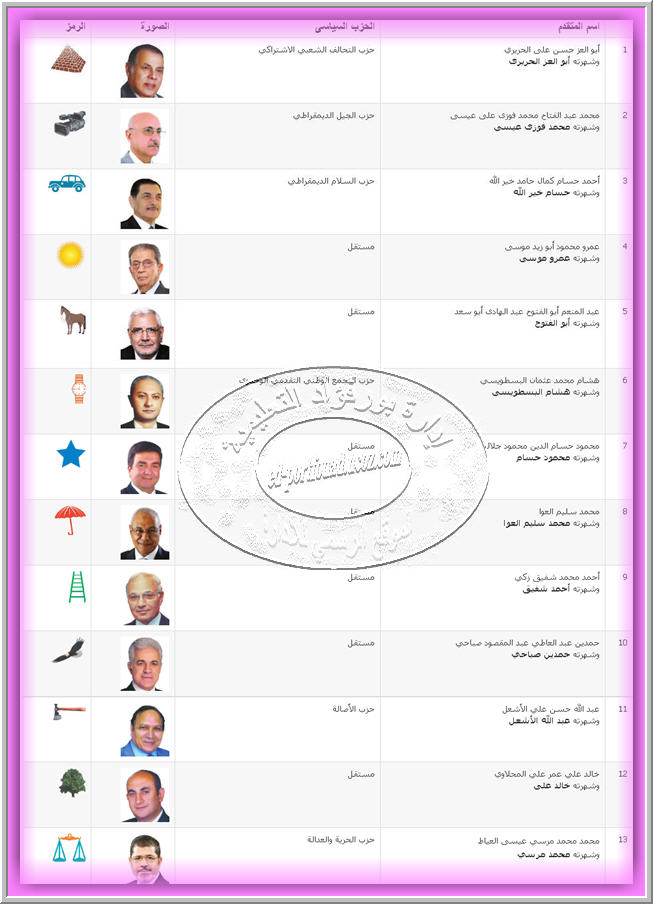 يمكنك التعرف على لجنتك الانتخابية من خلال الموقع الرسمي للانتخابات الرئاسية 2012 من الضغط على الرابط التالي