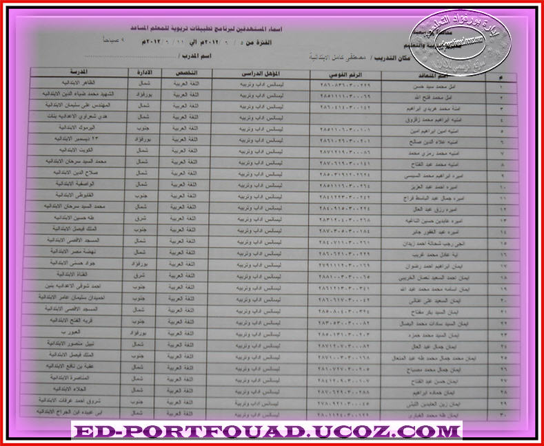 بيان باسماء المستهدفين لحضور برنامج التطبيقات التربوية للمعلم المساعد 2012