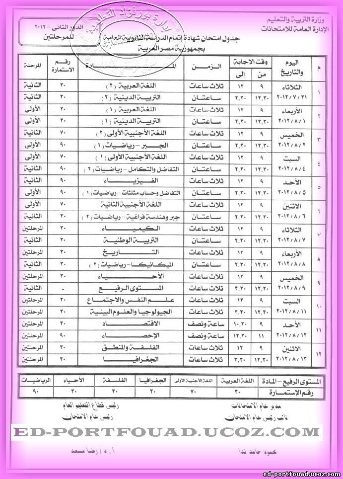 جدول الثانوية العامة الدور الثاني 2012