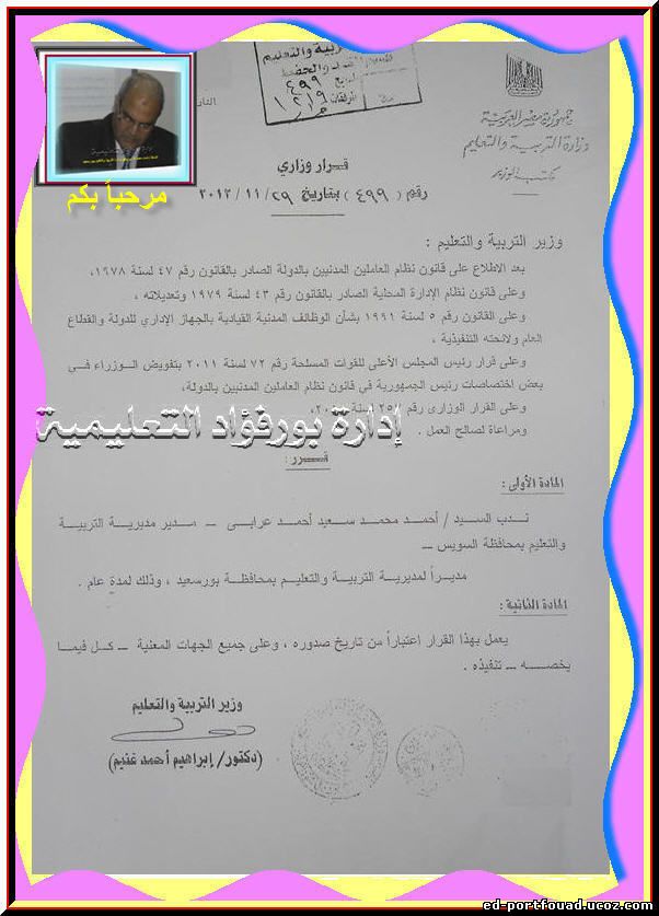 القرار الوزاري 499 بتاريخ 29/11/2012 والخاص بندب مدير مديرية التربية والتعليم ببورسعيد