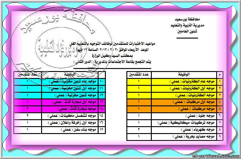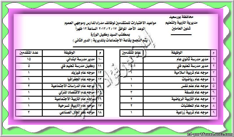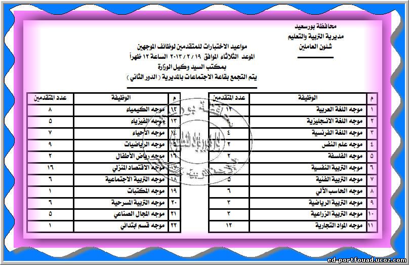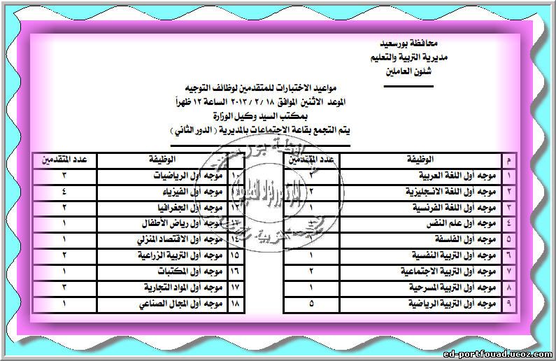 نعلن مواعيد الاختبارات والمقابلات الشخصية للوظائف التي اعلنتها مديرية التربية والتعليم ببورسعيد اضغط على اختياراتك .....