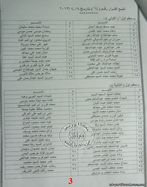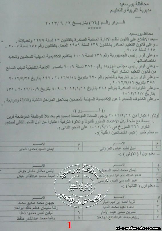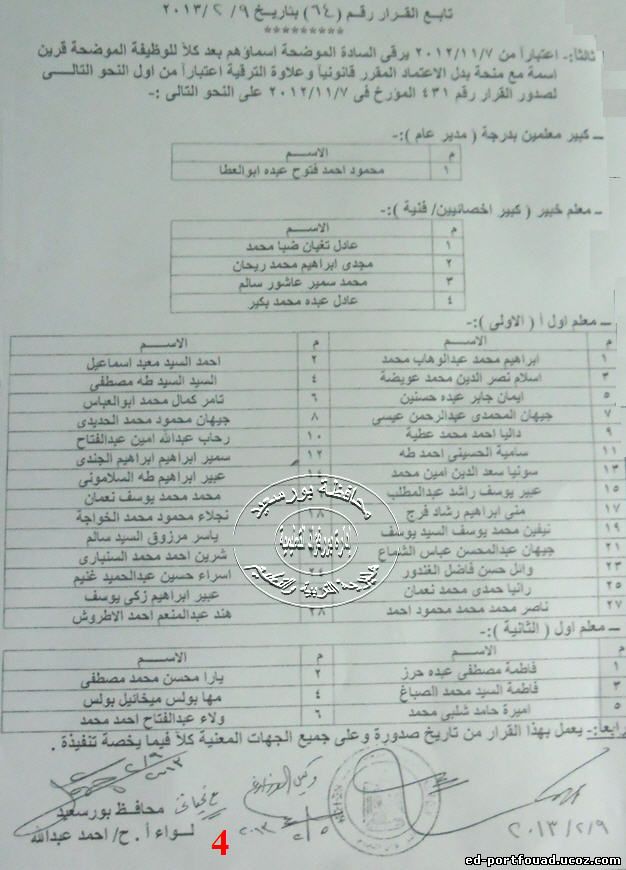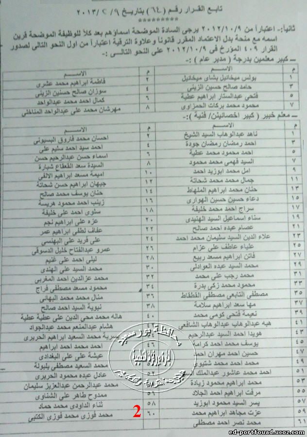 صدر القرار رقم 64 في 9/2/2013 للترفي لوظائف الكادر بملاحق المراحل الثانية والثالثة والرابعة والكشوف كالتالي : ـــ