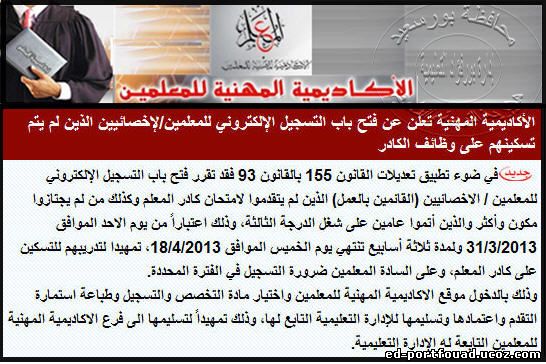 تم فتح باب التسجيل للمعلمين /// الاخصائيين الذين لم يتم تسكينهم على وظائف الكادر في الفترة من 31/3/2013 حتى 18 / 4 / 2013